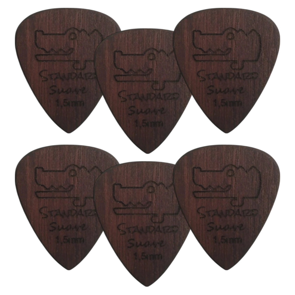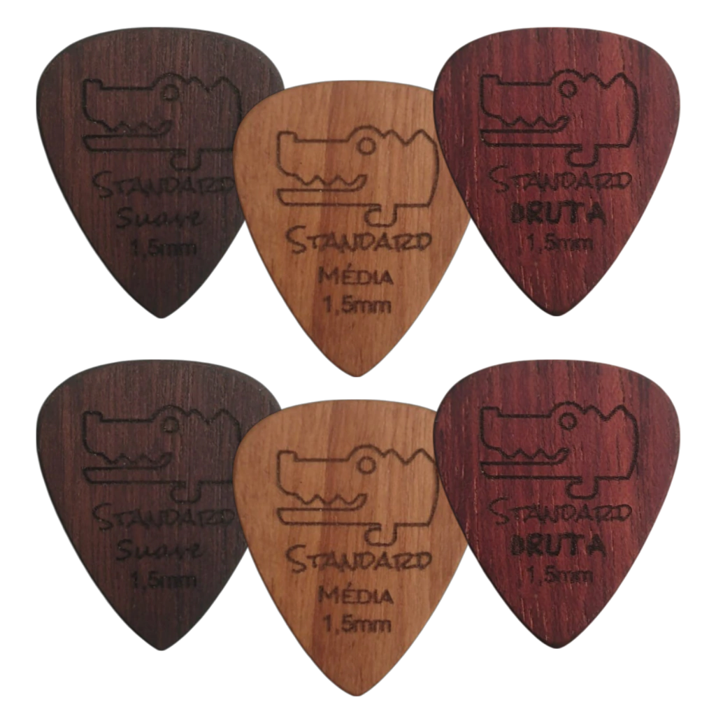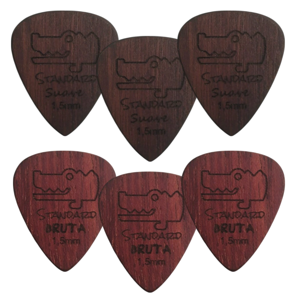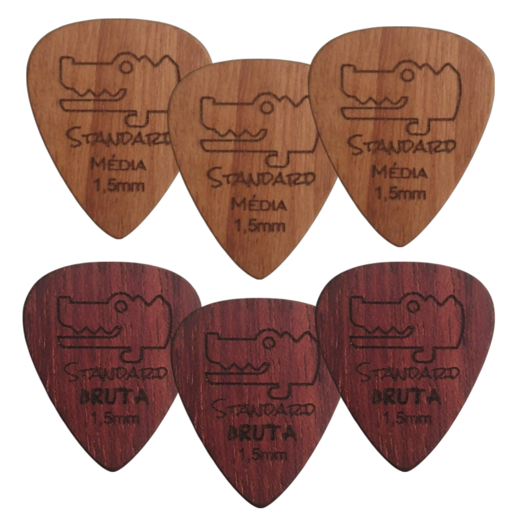 ***Todas as palhetas de madeira são rígidas, não são flexiveis como as de plástico. A dureza é sentida ao tocar nas cordas (mais macias tem um toque mais aveludado, mais duras tem um toque mais áspero, que dá uma leve raspada nas cordas e traz um leve estalado característico)